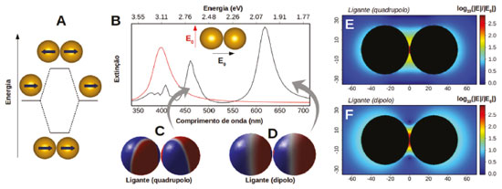 As alterações espectrais observadas na Figura 10B podem ser entendidas de forma semelhante ao formalismo de orbitais moleculares, em que as funções de onda que descrevem a dinâmica eletrônica (plasmon) podem interferir em fase (formando um estado ligante) ou fora de fase (formando um estado antiligante). Esta ideia (comumente chamada pelo termo inglês "plasmon hybridization") está representada de forma esquemática na Figura 12A para o caso do acoplamento entre os modos dipolares de duas nanoesferas quando a polarização é paralela ao eixo de separação entre as partículas (Figura 10B). Nesta figura as setas são representações gráficas das polarizações da nuvem eletrônica em cada nanopartícula devido a excitação do plasmon de superfície. De forma semelhante, pode-se esperar interações deste tipo para polarização perpendicular ao eixo de separação entre as partículas (Figura 10C), embora neste caso as energias dos modos ligante e antiligante devam ser próximas daquela para a nanopartícula individual (Figura 10C). Da mesma forma, o modelo pode ser aplicado a modos de maior ordem, como quadrupolares.