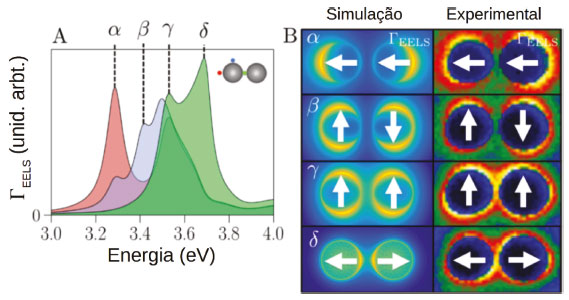 ![]() Figura 13. (A) Espectros EELS simulados para incidência de feixe de elétrons em diferentes posições (inserto na figura). (B) Mapa da probabilidade de perda de energia para os modos indicados por α, β, γ e δ. As imagens simuladas são comparadas com imagens experimentais. Reproduzido e adaptado com permissão da ref. 133. Copyright 2020 American Chemical Society