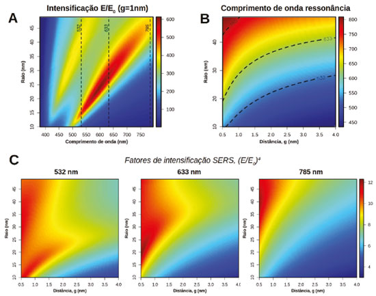 A Figura 14A apresenta os valores da intensificação local do campo elétrico (E/E0) no centro do HS para AgNs separadas por uma distância entre as superfícies (g na Figura 10) de 1 nm. Os resultados são apresentados em função do comprimento de onda da radiação incidente e do raio das AgNSs formando os dímeros. A exemplo do que é observado Figura 10 (espectros de extinção), para cada tamanho na Figura 14A são observadas duas bandas no perfil de intensificação do campo elétrico que apresentam deslocamento para maiores comprimentos com o aumento do tamanho das AgNSs. Maiores intensificações são observadas para o caso do acoplamento entre os modos dipolares (ressonância em maior comprimento de onda) do que no caso de acoplamento envolvendo modos de maior ordem (menor comprimento de onda). Além da dependência das ressonâncias nos perfis de intensificação com o tamanho das nanopartículas, há dependência com a distância de separação entre as superfícies (g). Esta dependência é apresentada na Figura 14B que contém um mapa dos comprimentos de onda de ressonância para o modo de menor energia em função dos parâmetros raio e distância g. Nas Figuras 14A e 14B são indicados por linhas tracejadas três comprimentos de onda tipicamente utilizados para obtenção de espectros Raman (SERS): 532, 633 e 785 nm. Os dados mostram que diferentes configurações de tamanho e distância entre partículas apresentam plasmon de superfície que estão mais em ressonância com um destes comprimentos de onda e, portanto, devem apresentar performances diferenciadas em função da radiação incidente. A Figura 14C apresenta o mapa dos fatores de intensificação SERS (Eq. 10) para os três comprimentos de onda destacados. De forma geral, maiores intensificações SERS são observadas para menores valores de g (por exemplo 1 nm, que será tomado como referência no que segue), situação que leva a uma grande concentração de campo no HS. A utilização de radiação laser em 785 nm leva a maiores intensificações SERS para nanopartículas maiores (raios entre 40 e 45 nm), já que esta radiação está em ressonância com a excitação plasmônica para estas configurações de tamanho e valores de g. Para laser em 633 nm, por outro lado, são observadas maiores intensificações para nanopartículas menores, por exemplo, com raios entre 20 e 25 nm. Dentre os três exemplos, esta radiação é a que leva às maiores intensificações SERS no caso de dímeros de AgNSs. Por fim, para radiação em 532 nm são observadas altas intensificações SERS tanto para partículas pequenas (raios 10 e 20 nm), quanto para partículas maiores (raios entre 30 e 45 nm). No primeiro caso (partículas pequenas), esta radiação excitante em 532 nm está em ressonância com plasmon de superfície associado ao acoplamento entre modos dipolares, enquanto que para partículas maiores a ressonância ocorre com o acoplamento envolvendo modos de maior ordem (quadrupolo veja Figura 14A). A Figura 15 apresenta os perfis de intensificação SERS em função do comprimento de onda da radiação incidente para o caso de dímeros de nanoesferas de Ag (AgNSs) e Au (AuNSs) em água.