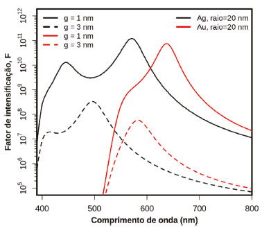 ![]() Figura 15. Simulação dos perfis de intensificação SERS em função do comprimento de onda da radiação incidente para dímeros de AgNSs (preto) e AuNSs (vermelho). Duas separações entre as superfícies das nanoesferas são consideradas: g = 1 nm (linhas cheias) e g = 3 nm (linhas tracejadas)