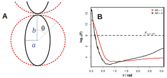 ![]() Figura 16. (A) Representações esquemáticas de nanopartículas de diferentes razões de aspecto formando dímeros: nanoelipsóides (preto) com razão de aspecto AR=b/a=1 e nanoesferas (vermelho) com AR=1. O ângulo θ é utilizado para ambas estruturas para indicar a variação espacial dos fatores de intensificação SERS a partir dos HSs (θ = 0 rad). (B) Dependência espacial dos fatores de intensificação para dímeros de nanoelipsóides (preto) e nanoesferas (vermelho) de Au. As AuNSs apresentam raio de 20 nm e os parâmetros a e b foram escolhidos para apresentar o mesmo volume que as AuNSs. Reproduzido da ref. 147