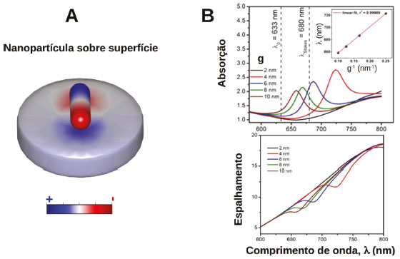 ![]() Figura 17. (A) Esquema ilustrativo da distribuição para um AuNR sobre a superfície de um material suporte. A excitação do modo longitudinal do AuNR leva a criação de uma distribuição de carga espelhada na superfície do suporte. (B) Efeito da alteração da distância (g) entre a superfície de um AuNR (AR=3) e do suporte (superfície de Au) sobre os espectros de absorção e espalhamento. Reproduzida com permissão da ref. 156. Copyright 2020 American Chemical Society