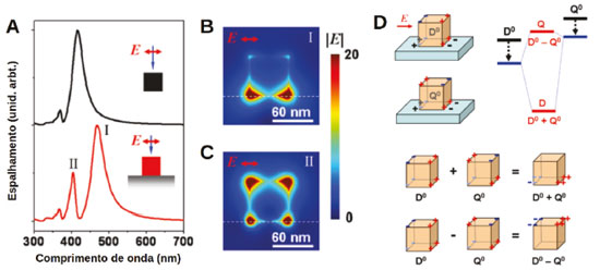 ![]() Figura 18. (A) Espectros de absorção de nanocubos de Ag de 60 nm em ar (preto) e depositado sobre vido (vermelho). (B) e (C) apresenta mapas de intensificação de campo elétrico para os modos indicados por I e II, respectivamente, em (A). (D) modelo para interação em fase e fora de fase para os modos dipolar e quadrupolar. Reproduzida com permissão da ref. 76. Copyright 2020 American Chemical Society
