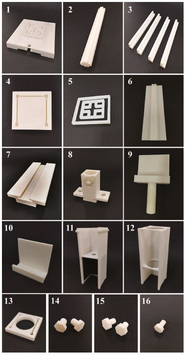 ![]() Figura 2. Peças impressas em 3D para a confecção do dispositivo para medição de ângulo de contato