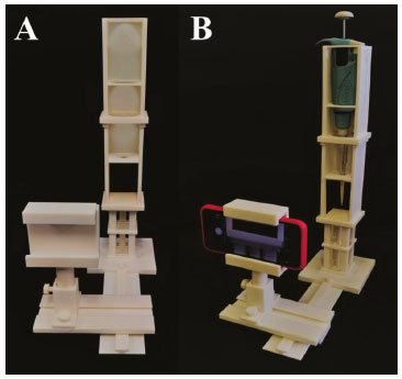 ![]() Figura 4. Dispositivo para medição de ângulo de contato impresso em 3D utilizando filamento ABS: visão frontal (A) e lateral, contendo um smartphone e micropipeta acoplados (B)