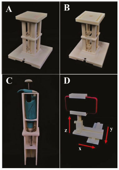 ![]() Figura 5. Dispositivo 3D para medição de ângulo de contato: bases de deposição da solução (gota) para superfícies planas (A) e cilíndricas (B), suportes para micropipeta (C) e smartphone (D)