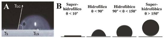 ![]() Figura 6. Obtenção do ângulo de contato (θ) (γS: energia de superfície do sólido; γLG: tensão superficial do equilíbrio líquido-gasoso; γLS: energia da interface líquido-sólido) (A). Classificação do ângulo de contato obtido para diferentes comportamentos de fluidos com uma superfície (B)