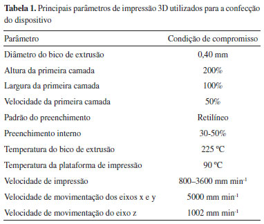 Impressão das peças e montagem do dispositivo A impressão do dispositivo foi realizada utilizando uma impressora 3D SETHI 3D S3 (Sethi3D, Brasil). A técnica de FDM foi utilizada para a impressão do dispositivo devido as suas vantagens como elevada acessibilidade, relativo baixo custo e fácil manuseio.16,20,21 Esta técnica vem sendo amplamente empregada para impressão 3D dentre as técnicas que requerem o uso de filamentos poliméricos termoplásticos, tal como o ABS utilizado neste trabalho. Antes da impressão, uma fina camada de cola em bastão foi aplicada sobre a plataforma de impressão. Esse procedimento foi realizado antes de cada impressão, e contribuiu para a melhor aderência das peças à plataforma, impedindo a sua movimentação durante o processo de impressão. O dispositivo foi composto por 26 peças, em que a maioria dos parâmetros de impressão foi mantida nos padrões predefinidos pelo software Simplify 3D para o filamento de ABS. Os parâmetros diâmetro do bico de extrusão, temperatura do bico de extrusão, temperatura da plataforma de impressão e velocidade de impressão foram alterados para garantir a melhor qualidade das peças. Devido à elevada temperatura do bico de extrusão, o cooler de resfriamento do bico foi mantido desligado durante todo o processo de impressão com o intuito de evitar possíveis falhas e rachaduras nas peças, causadas por choque térmico no material. Os parâmetros avaliados, tal como suas condições de compromisso podem ser observados na Tabela 1.