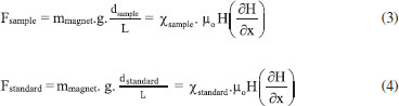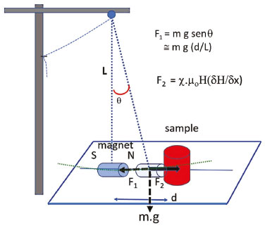 Experimental section The magnetic measurements were carried out with a miniature magnet rod, e.g. 10 mm length and 5 mm diameter, composed by a Nd2Fe14B alloy (11.0 kOe), available in the market by less than U$ 25 cents.9 The pendulum is composed by the magnet rod suspended from a convenient support, such as a door frame, using a sewing thread tied to a small adhesive tape, as shown in Figure 2. The magnet should be accommodated at the horizontal position. With the pendulum mounted, a graph millimetric paper should be placed below the magnet rod, keeping a distance of about 5 to 10 mm from the ground. The suspended magnet performs exactly like a compass; its spontaneous orientation defines the SN magnetic axis which should be indicated in the graph paper by a straight line. The SN axis provides a guide line for approaching the sample close to the magnet. But the critical point for the success of the experiment is the choice of the place and time for performing the experiment. The pendulum is extremely sensitive to any air current and trepidation. It responds to less than 0.2 mm perturbations from the sample. For this reason, the performance involves a meditation like posture, requiring complete silence and confinement. Iron and nickel objects should also be removed from the proximity, but their presence is readily signaled by the magnetic probe, which acts as a compass. The best choice is to have the door closed, using a chopstick fixed at the top frame with an adhesive tape, in order to work as a cantilever. The sewing thread should be long enough to be fixed also at the lateral frame, as in Figure 2. The sample should be finely grinded and placed into a cylindrical screw cap tube, up to 10 mm height or more. It should be compacted by knocking on the table, or preferentially by pressing inside the tube with small piston (e. g. from a 1 mL syringe). The tube should be positioned on the magnetic line of the graph paper and carefully moved towards the magnet in order to make contact. At the interacting distance, the pending magnet is readily attracted by the paramagnetic sample. It is recommended to keep the system in this form for a few minutes, to stabilize the probe. After this, the sample should be displaced carefully along the axis. The magnet will remain attached to the sample up to a limiting distance where the pendulum restoring force exceeds the magnetic attraction. This detachment point can be precisely measured on the graph paper. The measurements should be repeated many times for improving accuracy. Since the pendulum response is extremely sensitive, one can use a smartphone for imaging and amplifying the reading, providing precise values of the oscillation distance with at least ± 0.2 mm accuracy.
