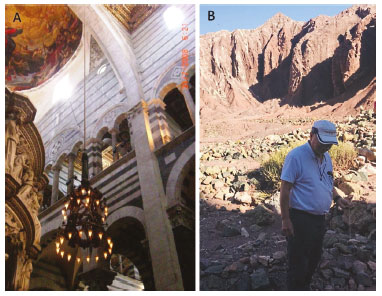 ![]() Figure 1. (A) Galileo's theory was inspired from this chandelier movements, in 1583, at the cathedral of Pisa (B) the pendulum balance was inspired from an excursion to the Atacama desert, looking for meteorites with a magnetic probe (credit: H. E. Toma)
