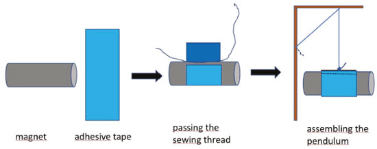 The idea of combining pendulum oscillations and chemical magnetism was conceived during an excursion to the Atacama desert, in Chile. Atacama is one of the preferred places for excursionists interested in meteorites and there is a remarkable museum and research center located there.11 In our journey to the desert, a miniature supermagnet suspended by a sewing thread was employed as a prospecting pendulum probe (Figure 1B). At the proximity of magnetic rocks the oscillation of the pendulum changes dramatically while moving in the direction of the mineral target. Surprisingly, such simple strategy did work well and was very fun! Now, the same pendulum approach is being explored for studying the magnetic properties of inorganic compounds. The use of the pendulum as a magnetic balance requires the understanding of the physics of the pendulum and the nature of the magnetism in chemical compounds. The experimental setup uses just a small magnet suspended by a sewing thread. The pendulum can be easily assembled as indicated in Figure 2, using a door frame to support the magnet. The chemical compounds of interest should be supplied by the professor. Although the experiment is rather simple, it is very rich and provides a unique opportunity for teaching physical and chemical concepts at home.
