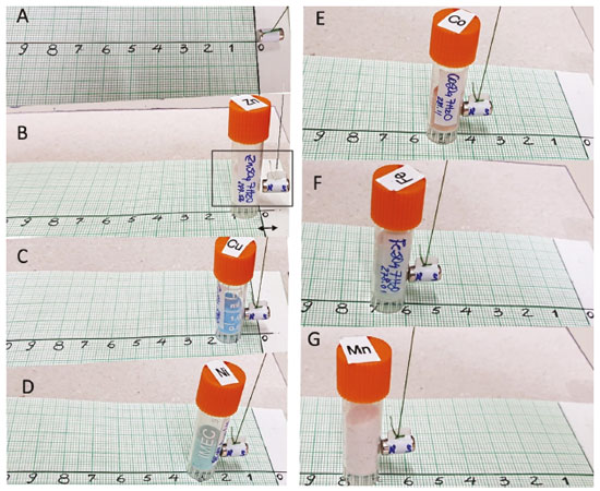 ![]() Figure 4. Typical measurements showing (A) the starting point with the magnet aligned with the magnetic axis, and typical rupture distances at the critical point for (B) ZnSO4.7H2O (diamagnetic repulsion can be seen in the frame), (C) CuSO4.5H2O, (D) NiSO4.7H2O, E) CoSO4.7H2O, F) FeSO4.7H2O and (G) [Mn(Ac)2(H2O)4