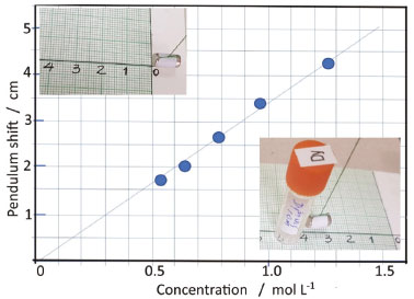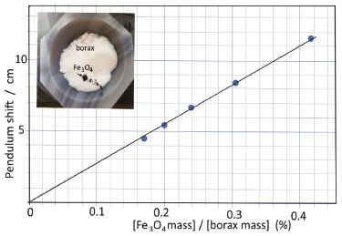 ![]() Figure 6. Probing Fe3O4 superparamagnetic nanoparticles with the pendulum balance (L = 150 cm), after dispersing a minimum amount of the solid (e. g. 10 mg) into a large excess of borax (5 g), and grinding in an agate mortar, as illustrated in the inset (the circle sizes represent the errors involved)