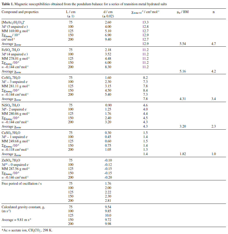Accessing the pendulum constants In addition to the magnetic susceptibility measurements, it is also possible to extract the physical parameters involved in the experiment, such as the pendulum period, P, and the gravity constant, g. The pendulum period is the time it takes for the oscillating object to complete its cycle, e. g. starting from one extreme, travel to the opposite extreme, and then return to the original location. Theoretically, for small angles oscillation, P is given by ![]() The pendulum periods can be precisely measured by recording the number of oscillations during an interval of time, e. g. 30 s, for L = 75 - 200 cm, as shown in Table 1. The observed values were proportional to L1/2, as expected theoretically. From the value of T, the gravity constant g can be calculated by ![]() yielding an average value of 9.81 m s-2, in good agreement with the well known gravity acceleration constant.17 Concluding remarks The proposed experiment is suitable for demonstrating the nature of paramagnetic and diamagnetic substances, and for teaching basic principles of physics and chemistry at home, particularly during this covid-19 pandemics.18 The balance construction is quite simple and cheap, and the Galileo's pendulum theory can be used to guide the experiments and to calculate the gravity acceleration constant. For explaining the chemical magnetism, a quantitative approach has been applied by equilibrating the pendulum equations and the magnetic forces. In this way, it has been possible to calculate the magnetic susceptibilities and evaluate the number of unpaired electrons in the metal complex. Since magnetism is related to the electronic structure, further interpretation can be developed, demanding ligand field theory and concepts from interelectronic repulsion and high spin and low spin configurations. Although one can obtain magnetic susceptibilities of most transition metal elements in this way, the pendulum balance is not particularly suitable for weakly paramagnetic substances, such as copper(II) compounds (3d9 configuration, one unpaired electron), because of the large experimental errors involved. At the other extreme, strongly paramagnetic Gd3+, Dy3+, Ho3+ ions, and typical superparamagnetic nanoparticles will interact too strongly with the magnetic probe, and the results depart from the theoretical approximations. In this case, appropriate dilution with diamagnetic substances is necessary in order to use the pendulum balance.
