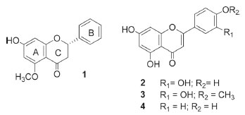 ![]() Figure 1. Structures of the flavonoids alpinetin (1), luteolin (2), diosmetin (3), and apigenin (4) isolated from Fridericia speciosa