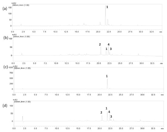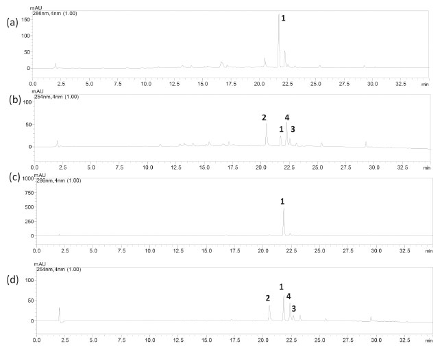![]() Figure 2. HPLC-DAD chromatogram of (a) the ethanol extract of Fridericia speciosa leaves at λ = 286 nm; (b) the ethanol extract of F. speciosa leaves at λ = 254 nm; (c) the ethyl acetate-soluble fraction of F. speciosa leaves at λ = 286 nm; and (d) the ethyl acetate-soluble fraction of F. speciosa leaves at λ = 254 nm. Chromatographic conditions: oven temperature = 40 ºC, flow = 0.6 mL min-1, mobile phase = methanol (A) and water + 0.4% formic acid (B) gradient from 20 to 100% A for 30 min, 100% A for 5 min, and Phenomenex Kinetex C18 column. Compounds: alpinetin (1), luteolin (2), diosmetin (3), and apigenin (4)