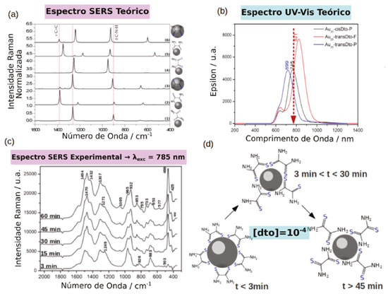 Estudos teóricos no sistema dto-AuNP mostram que cada modo de coordenação do ligante apresenta transições de transferência de carga metal-ligante de intensidades e energias diferentes (Figura 2b), sendo que a forma monodentada tiona-Au, {AuS(NH2)CCS(NH2)}, apresenta a maior probabilidade de transição e se encontra em ressonância com o comprimento de onda de excitação de 785 nm utilizado nos experimentos.49 Portanto, conforme a espécie cis bidentada é convertida na espécie trans monodentada a contribuição do mecanismo CM para o efeito SERS aumenta gradualmente, levando ao aumento do sinal SERS observado em função do tempo (Figura 2c).