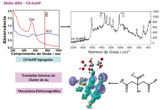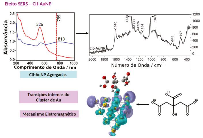 ![]() Figura 3. Efeito SERS em AuNP estabilizadas com citrato. (a) Espectro de extinção de uma suspensão de cit-AuNP antes (curva vermelha) e após a agregação (curva azul). (b) Espectro SERS de agregados de cit-AuNP. (c) Estado excitado teórico para um complexo Au20-citrato considerando excitação em 785 nm. Superfícies ciano representam a localização de elétrons e superfícies roxas a localização de buracos.Adaptado da referência 23