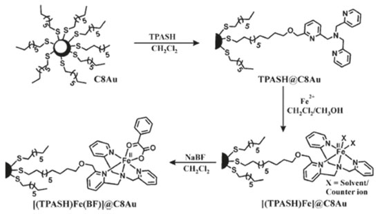 Resultados similares foram observados por Theil et al. para uma série de complexos tiocianato-Ru-carboxibipiridina comercialmente disponíveis (N719, N749 e Z907) na superfície de nanobastões de ouro e nanoestrelas de Au/Pt/Au.83,84 Vohlídal et al. tentam explicar o efeito da interação entre nanopartículas de prata e complexos de ferro(II) terpiridina nos níveis eletrônicos do complexo e, como essa perturbação altera a espalhamento Raman do sistema, em relação ao complexo de ferro isolado.85 Através do perfil de excitação do espectro Raman do complexo isolado e na superfície das nanopartículas de prata, os autores mostram que não ocorre perturbação dos níveis eletrônicos do complexo, contudo, nesse caso, não há a formação de uma ligação covalente entre a terpiridina e a prata. Apesar de se tratar de apenas uma adsorção física, esse artigo mostra uma abordagem interessante para o estudo dos efeitos da interação na interface partícula-molécula. Paine e colaboradores mostraram por XPS que a interação do ligante TPASH@C8, Figura 8, ocorre através da formação de ligações covalente entre as espécies Au0 e S-1. Os autores mostram um aumento da atividade catalítica dos complexos de ferro(II) formados na superfície das partículas funcionalizadas com TPASH de cerca de 8 a 10 vezes para reações de decarboxilação do benzilformiato,86 além disso, observaram um aumento no número de ciclos catalíticos. Os autores justificam essas mudanças apenas em função do aumento da área superficial e da auto-organização dos complexos na superfície do ouro, o que facilitaria o acesso do substrato ao sítio ativo do complexo, deixando de lado os efeitos da interação eletrônica entre as nanopartículas e o complexo.
