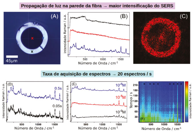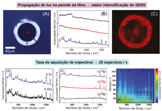 ![]() Figura 9. Nanocompósitos de GO@AuNR como substratos SERS. (a) Imagem do microscópio óptico da seção transversal da fibra capilar. Os pontos marcados referem-se a uma posição de aquisição de espectro relacionada à mesma curva de cor em (b). (b) O gráfico vermelho foi adquirido com uma potência de laser de 105,2 µW na interface sílica/capilar e as curvas em preto e azul com potência de laser de 4,82 mW foram adquiridas incidência de luz diretamente na parede de sílica e no buraco capilar, respectivamente. (c) Característica de guia de fibra para uma luz de 633 nm lançada exatamente na interface sílica / furo capilar com 23,7 µW. (d) Espectros SERS de RH640 em concentrações de 10-6 M e tempos de integração de 0,5 s (azul) e 0,05 s (preto). Potência do laser de 105 µW. (e) Espectros SERS de RH640 em concentrações de 10-6 M (azul), 10-8 M (vermelho) e 10-9 M (preto). Potências de laser de 105 µW (azul) e 1,85 mW (vermelho / preto). Tempo de integração de 0,5 s. (f) Séries temporais de espectros SERS para RH640. Potência do laser de 105 µW e tempo de integração de 0,5 s. Adaptado da referência 120