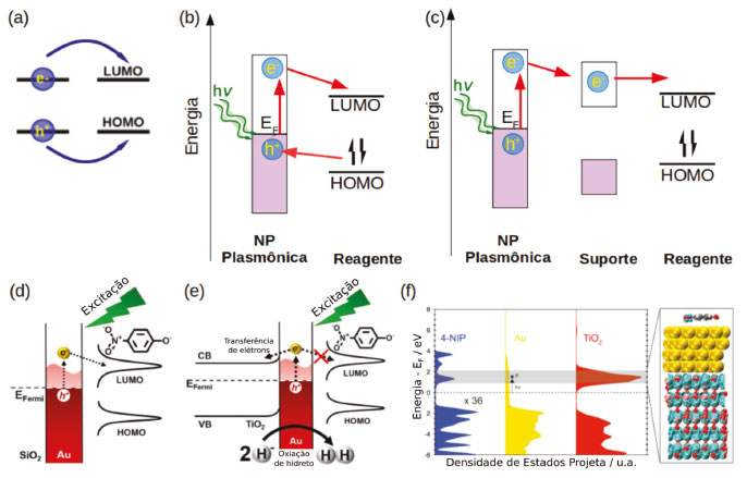 ![]() Figura 13. Catálise plasmônica por transferências de elétrons (a). (b) Mecanismo de transferência de elétrons e buracos diretamente entre a nanopartícula e o reagente. (c) Mecanismo de transferência de elétrons entre a nanopartícula plasmônica e um semicondutor de suporte e o reagente. (d) Exemplo de transferência de elétrons entre AuNP e p-nitrofenol. (e) Exemplo de transferências se elétrons em AuNP suportadas em nanopartículas de TiO2. (f) Densidades de estados calculadas por DFT para o sistema contendo AuNP, TiO2 e p-nitrofenol. Adaptado da referência 130