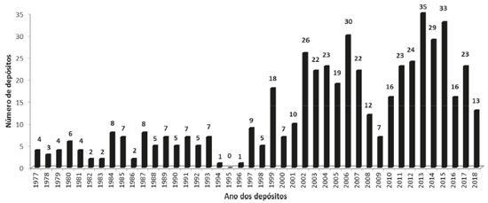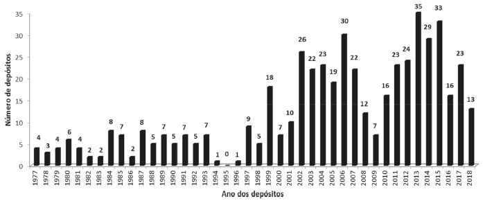 Observa-se que a Vale é a empresa com o maior tempo no mercado, seguida respectivamente pela Heringer, Oxiteno, Fertipar e Braskem. Em termos de vendas líquidas, também se encontra na liderança, mas as outras empresas não obedecem à mesma ordem anterior, sugerindo que não há uma relação direta entre tempo de atuação no mercado e vendas líquidas. Análise do portfólio de patentes Pedidos de patentes das cinco empresas depositados no INPI Após a busca realizada no site do INPI por patentes depositadas pelas cinco empresas foco deste estudo (utilizando os respectivos CNPJs), foram encontrados 510 depósitos de pedidos de patentes. A quantidade de depósitos demonstra o grande interesse das mesmas na proteção de sua propriedade industrial por meio de patentes, podendo indicar uma estratégia de negócios das organizações em relação à relevância das tecnologias do ponto de vista econômico, já que as empresas buscam retornos dos investimentos, ao protegerem seus ativos oriundos do desenvolvimento de pesquisas tecnológicas. Dos 510 pedidos de patentes, 59% pertencem à Vale, 27% à Braskem, 13% à Oxiteno e 1% à Heringer. Não foram encontradas patentes depositadas pela Fertipar na base de dados do Instituto Nacional de Propriedade Industrial. A distribuição anual dos depósitos de pedidos de patentes das cinco empresas analisadas pode ser observada na Figura 1.