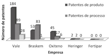 Quando analisadas de forma individual, observa-se que todas as empresas possuem a maioria das suas patentes do tipo patentes de invenção. A maior discrepância acontece com a Braskem (com 98% de patentes deste tipo) e a Oxiteno não apresentou patentes do tipo modelo de utilidade. Patentes de produto x patentes de processos Das patentes recuperadas, identificou-se que 284 depósitos são de produto (55,7%), 191 de processo (37,4%) e 35 estão em período de sigilo (6,9%). De acordo com a Figura 3, a Oxiteno é a empresa com a maior porcentagem de patentes de produto relativa aos seus depósitos individuais (66%), seguida pela Vale (61%), Heringer (50%) e Braskem (39%). Das 35 patentes em período de sigilo, mais de 80% são da Vale, o que mostra que a empresa continuou a ser a depositante líder nos últimos 18 meses anteriores a julho de 2018.