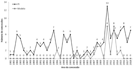 ![]() Figura 2. Totais de patentes de invenção e de modelo de utilidade