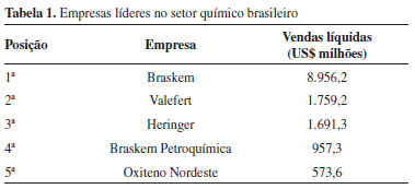 RESULTADOS E DISCUSSÃO Análise preliminar Identificação das principais empresas químicas do país As cinco maiores empresas químicas brasileiras foram identificadas segundo sua posição no mercado, tendo como base o ranking estabelecido a partir das lideranças em vendas líquidas (calculadas pela diferença aritmética entre o valor das vendas brutas, deduzidas das devoluções e abatimentos, e os impostos sobre vendas), conforme apresenta a Tabela 1.
