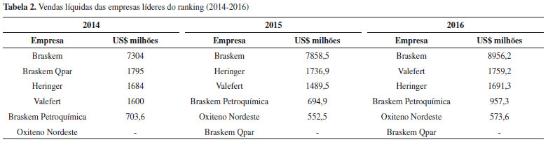 Em um levantamento das vendas líquidas realizado nos dois anos anteriores a 2016, a Tabela 2 mostra que a Braskem já ocupava a liderança do ranking, enquanto a Valefert subiu uma posição por ano, passando da quarta para a segunda posição em 2016.