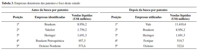 A Heringer conseguiu melhorar sua renda líquida de 2014 para 2015, o que lhe garantiu a segunda posição, evento que pode ter como reflexo o início das atividades nas fábricas próprias de Candeias (BA) e a entrada das empresas OCP e PCS na sua base acionária. Porém, em 2016, devido à diminuição de sua venda líquida, em 2,6% em relação ao ano anterior, regrediu para a terceira posição. A Braskem Petroquímica passou de quinta para a quarta na classificação, mantendo sua posição em 2016. A Oxiteno Nordeste não figurava entre as cinco maiores empresas do ranking em 2014, pois a Braskem Qpar, outra subsidiária da Braskem, estava na lista, em segundo lugar. Apenas em 2015, quando a Braskem Qpar foi incorporada à Braskem, a Oxiteno Nordeste passou a integrar o ranking em quinto lugar, permanecendo na mesma posição no ano posterior. Vale ressaltar que, mesmo a Revista EXAME tenha utilizado a denominação "Indústrias Químicas e Petroquímicas" para categorizar as empresas do mesmo ramo industrial, neste estudo foi utilizada a denominação "Indústrias Químicas". Segundo informações da Associação Brasileira da Indústria Química (ABIQUIM), a indústria petroquímica é parte da indústria química, portanto, as classificações oficiais deste setor não utilizam em separado o conceito "petroquímica".15 Adequação das empresas analisadas mediante respectivos depósitos de patentes Ao ser iniciada a busca pelas patentes referentes a cada uma das empresas elencadas por meio dos respectivos CNPJs, notou-se que algumas delas eram subsidiárias de outras (Valefert da Vale, Braskem Petroquímica da Braskem e Oxiteno Nordeste da Oxiteno) e suas patentes tinham como depositantes as empresas principais. Diante do exposto, decidiu-se utilizar as detentoras das patentes para fins de pesquisa patentária e posterior análise, fazendo com que também fosse necessário acrescentar a sexta colocada do ranking da EXAME, a Fertipar, já que a Braskem Petroquímica é subsidiária da Braskem e já se encontra na lista. Tais mudanças podem ser observadas na Tabela 3.
