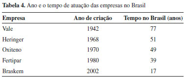 Ao serem elencadas as novas empresas, também segundo informações do banco de dados de Maiores & Melhores da EXAME, chamou atenção o fato das vendas líquidas da Oxiteno serem menores que a da Oxiteno Nordeste, fazendo com que a Fertipar ficasse à frente dela na nova classificação. A Vale é uma empresa predominantemente mineradora, mas como ao longo da sua história investiu no setor químico brasileiro por meio de subsidiárias, foi mantida como uma das cinco empresas estudadas. Como poderá ser visualizado posteriormente pela análise das Classificações Internacionais de Patente (CIPs), a Vale detém patentes na seção C (Química e metalúrgica), onde ocupa a segunda posição, e na seção A (Operação de processamento e transporte). Após um levantamento histórico realizado nos sites das empresas Braskem, Vale, Heringer, Oxiteno e Fertipar, foi possível identificar o ano e o tempo de atuação no mercado brasileiro (Tabela 4).
