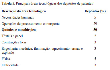 Percebeu-se predominância de patentes de produtos para todas as empresas analisadas, com exceção da Braskem, que possui 61% de patentes de processos e da Heringer com 50% de cada tipo. Geralmente o segredo é preferido em lugar da difusão da inovação, sobretudo quando a inovação é de processo, visto que, quanto mais a patente se relaciona com processos e não com produtos, maior o poder de mercado da empresa que detém esse direito e a implementação desse tipo de barreira à entrada se traduz por uma diminuição da concorrência.22 Patentes depositadas via PCT Quando analisadas as modalidades dos tipos de depósitos, verificou-se que das 510 patentes depositadas, apenas 67 (aproximadamente 13%) foram depositadas via PCT. Esse mecanismo é utilizado pelas maiores empresas, instituições de pesquisa e universidades do mundo para obter uma proteção internacional por meio de patentes. O PCT facilita o cumprimento de diversas exigências formais, adia os maiores custos associados com a proteção multinacional e oferece uma base sólida para tomar decisões em matéria de patentes.23 Portanto, esse baixo quantitativo identificado indica que não há grande interesse por parte das principais empresas químicas nacionais na proteção dos seus produtos e processos em mais de uma região geográfica, impossibilitando uma maior dinâmica de inovação através da comercialização destes. A empresa que mais utilizou de depósito via PCT foi a Braskem, com 34 depósitos (24,8% do total de depósitos da empresa), onde a grande maioria possui os Estados Unidos (56%) como unidade unionista, seguido pelo Brasil (33%) e Instituto Nacional de Patentes (11%). A maioria das patentes que possui unidade unionista em outro país foi depositada mediante parceria entre a Braskem e uma empresa internacional, indicando que a patente pode ter sido depositada fora do Brasil e sua proteção foi estendida para outros países, inclusive o Brasil. A Vale possui 31 depósitos via PCT, sendo que 94% possui como unidade unionista o Brasil, 3%, o Instituto Nacional de Patentes e 3%, o Canadá. Nota-se que mesmo a Vale possuindo 173 registros no INPI a mais que a Braskem, esta última possui mais pedidos de patentes via PCT. Porém, como quase a totalidade das patentes depositadas pela Vale via PCT possuem o Brasil como unidade unionista, isso indica que a Vale possui mais interesse em proteger suas criações fora do Brasil. Dos 68 depósitos realizados pela Oxiteno, apenas 2 foram realizados via PCT e, mesmo assim, aqui no Brasil. Não há registros de depósitos via PCT pela Heringer. Classificação Internacional de Patentes (CIP) Análises baseadas na Classificação Internacional de Patentes (CIPs) possibilitam o mapeamento da distribuição tecnológica dos documentos de patente, revelando as áreas nas quais as empresas estudadas têm direcionado suas pesquisas.24 Foi detectado que 92% dos documentos possuem CIP. Das patentes sem classificação, quase 93% não a possuem porque os documentos estão em período de sigilo. Do total de depósitos com CIP, foram identificadas 1085 classificações de patentes, com alguns documentos abrangendo mais de uma subclasse para sua caracterização. Desse total, observou-se que a seção com maior quantidade de pedidos de patentes é a C (química e metalúrgica), uma vez que tais pedidos foram realizados por empresas químicas. Entre as subclasses destacam-se compostos macromoleculares obtidos por reações compreendendo apenas ligações insaturadas carbono-carbono C08F (97), produção ou refino de metais e pré-tratamento de matérias-primas C22B (86) e compostos acíclicos ou carbocíclicos C07C (65). Após a seção C, vêm as seções B (operações de processamento e transporte) com 29% e as seções G (Física) e A (necessidades humanas) empatadas com 5%, conforme Tabela 5.