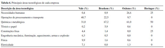 A Tabela 6 apresenta as porcentagens de cada empresa por área. Nota-se que todas elas possuem a área de química e metalurgia como majoritária, com exceção da Vale, que possui a maioria de suas patentes com classificações na área de processamento e transportes (40,7%). Isso se deve ao fato de que, ao contrário das outras, não se trata de uma empresa do ramo químico, mas sim de mineração, que investiu ao longo da sua história no setor químico através de subsidiárias, fazendo parte do rol de empresas estudadas neste trabalho por ser detentora das patentes da Vale Fertilizantes, como explicado anteriormente. Mesmo assim, a empresa possui como segunda área com mais patentes depositadas a química e metalurgia, atingindo 31% do total das CIPs.