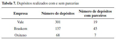 Principais parceiros no patenteamento Em relação às parcerias nos depósitos, todas as empresas se mostraram interessadas no depósito de patentes em parceira com outras instituições, com exceção da Heringer. A colaboração é um requisito para o sucesso da inovação tecnológica. Fatores como os menores ciclos de vida do produto, o aumento da complexidade tecnológica e os altos custos com PD&I tornam necessária a utilização de fontes externas de conhecimento por meio da colaboração entre universidades e indústrias e empresas concorrentes, por exemplo. Diante do exposto, a análise dos principais parceiros das empresas estudadas ajudaria a entender de onde estas empresas vêm buscando/obtendo conhecimento externo. De acordo com a Tabela 7, observa-se que, mesmo a Vale sendo a empresa com o maior número de patentes depositadas (301), foi a Braskem quem realizou mais depósitos em parceria com outras organizações (45), demonstrando maior interesse na utilização de fontes externas de conhecimento. Proporcionalmente, até mesmo a Oxiteno, com 68 depósitos, depositou mais patentes em conjunto em relação a Vale (cerca de 4% a mais).