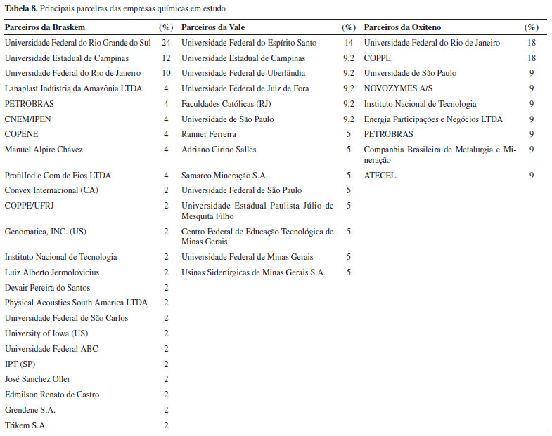A Tabela 8 mostra as principais parceiras das empresas no tocante aos depósitos de patentes (em porcentagem). Importante salientar que, às vezes, as empresas realizavam os depósitos de pedidos de patentes com mais de um parceiro.