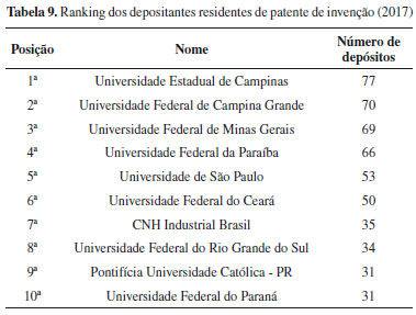 Como pode ser percebido, do total de 14 instituições parceiras da Vale, 11 colaborações são com instituições de ensino (78,6%), sendo a Universidade Federal do Espírito Santo o seu principal parceiro. Além disso, por meio dos dados coletados neste estudo, foi observado que em 4 patentes depositadas pela Vale, a Fundação de Amparo à Pesquisa do Estado de Minas Gerais (FAPEMIG), uma agência de indução e fomento à pesquisa e à inovação científica e tecnológica do estado de Minas Gerais, apareceu como cotitular, visto que é política da própria agência participar da patente por ela financiada. A Braskem totaliza 45 patentes junto com outras instituições, tendo como principal parceira a Universidade Federal do Rio de Janeiro (UFRJ), com 12 parcerias em depósitos. As instituições de ensino também ocupam um lugar de destaque, com 52% do total. A Oxiteno não possui pessoas físicas como parceiras de depósitos de pedidos de patentes e, também, não possui instituições de ensino como parceiras majoritárias. Das 11 patentes depositadas com parceiros, 2 foram com a UFRJ, 2 com o Instituto Alberto Luiz Coimbra de Pós-Graduação e Pesquisa de Engenharia e 1 com a USP. As parcerias entre instituições de ensino públicas ou privadas e empresas através de convênios de pesquisa possibilitam que os processos e/ou produtos possam ser desenvolvidos em parceria e produzidos e comercializados pela empresa, facilitando a transferência de tecnologia. De acordo com dados do INPI, o ranking dos dez principais depositantes residentes no país no ano de 2017, que foram responsáveis por 9,4% dos depósitos é, majoritariamente, ocupado por universidades estaduais e federais, conforme Tabela 9.