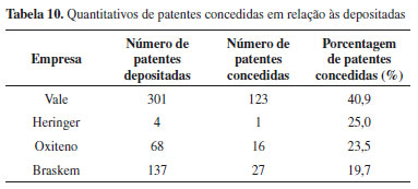 Tal intensidade de integração, entre outras coisas, pode ser justificada pelas características da Lei de Inovação Tecnológica, mais conhecida como Marco Legal de Ciência, Tecnologia e Inovação, que foi criada com o propósito principal de estimular as parcerias entre instituições acadêmicas e o setor produtivo brasileiro, incentivando o compartilhamento de recursos e facilitando o financiamento de P&D acadêmica por empresas privadas. É importante salientar que tal afirmativa deverá levar em consideração as políticas institucionais de cada empresa, caso existam, e suas respectivas peculiaridades.24 Uma maior compreensão da dinâmica da interação universidade-empresa aumenta a perspectiva dos atores envolvidos no processo, visto que as universidades podem ampliar seus relacionamentos de longo prazo. Direcionado a isso, os governos podem alinhar suas políticas com objetivos específicos baseados em parcerias estratégicas e as empresas podem construir relacionamentos duradouros com universidades, aprimorando sua estratégia de inovação.25 Chama a atenção o fato de não haver qualquer patente depositada em parceria entre as cinco empresas estudadas, indicando a ausência de colaboração entre empresas de um mesmo setor industrial. Além disso, observa-se que três das cinco empresas estudadas têm unidades no estado de Sergipe, mas nenhuma possui patentes depositadas em parceria com a Universidade Federal de Sergipe (UFS). Patentes concedidas e o backlog de patentes Desde o depósito no INPI, o pedido de patente passa por várias etapas, sendo que o resultado pode ser no sentido da concessão da patente ou de seu indeferimento. Uma vez que esse processo pode levar em média 10 anos, as patentes concedidas num determinado ano não podem ser comparadas com os depósitos realizados do mesmo período. Ao serem relacionadas as patentes depositadas por cada empresa e as patentes concedidas pelo INPI, nota-se que a quantidade de concessões é modesta. Novamente, o destaque fica para a Vale, que obteve a concessão de aproximadamente 41% de suas patentes, contra 25% da Heringer, 23,5% da Oxiteno e 19,7% da Braskem, o que equivale a 123, 1, 16 e 27 patentes concedidas, respectivamente. O baixo índice de concessões pode ter como possíveis motivos o estoque de pedidos de patente não examinado pelo INPI e a falta de novidade e atividade inventiva do pedido de patente, requisitos essenciais para que a carta-patente seja concedida. Os quantitativos de patentes concedidas em relação às depositadas podem ser observados na Tabela 10.