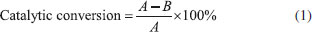 X-ray diffraction (XRD) patterns were collected using a Rigaku DX-2500 diffractometer with Cu Kα radiation (0.15406 nm) in the range of 10°-90° with a step size of 0.02°. Fourier transform infrared spectrometer (FT-IR) patterns were measured employing a Vertex 70 Fourier infrared spectrometer. The BET specific surface area (Brunauer Emmett Teller, BET) for determining the specific surface area, catalyst pore volume, catalyst pore size and distribution of the catalyst were tested employing ASAP 2020 specific surface area and mesoporous / microporous analyzer. Scanning Electron Microscope (SEM) images were observed applying a Hitachi HITA CHI S-3400N scanning electron microscope. H2 temperature-programmed reduction (H2-TPR) studies were carried out using a Chem-Star program temperature reduction instrument to observe the reduction characteristics of the catalysts. Prior to the experiment, the sample was pretreated in N2 (25 mL min-1) at 450 °C for 1 h. The catalytic activity of Pt-Rh-Pd / CeO2-ZrO2-La2O3-Al2O3 fibrous catalyst was evaluated in a Dong feng LZ6430BQBE car with a self-assembled catalytic device. As displayed in Figure 2, Pt-Rh-Pd / CeO2-ZrO2-La2O3-Al2O3 fibrous catalyst was wrapped on the surface of ceramic rods and fixed in the self-assembled catalytic device with metal mashes. The smoke and dust samplers were used to collect automobile exhaust. Both a portable infrared CO analyzer and a gas chromatography mass spectrometer were used to detect the components and contents of the exhaust. The catalytic conversion efficiency was calculated by the following formula in which A represented contaminant content before catalyst installation and B represent contaminant content after catalyst installation. ![]()