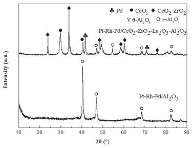 ![]() Figure 3. XRD spectrums of Pt-Rh-Pd / Al2O3 catalyst and Pt-Rh-Pd / CeO2-ZrO2-La2O3-Al2O3 catalyst