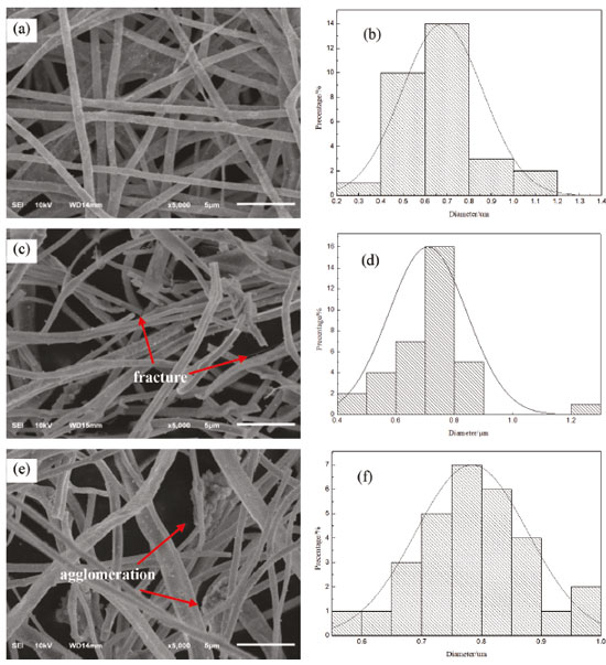![]() Figure 7. SEM images and diameter distribution histograms of Pt-Pd / CeO2-ZrO2-La2O3-Al2O3 fibrous catalysts ((a) 0.35%PtCl4, (c) 0.50%PtCl4, (e) 0.65%PtCl4)