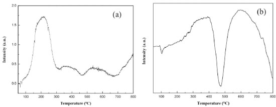![]() Figure 9. H2-TPR spectrum of Pt-Rh-Pd / CeO2-ZrO2-La2O3-Al2O3 fibrous catalyst (a) and Pt-Rh-Pd / Al2O3 fibrous catalyst (b)