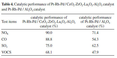 Pt-Rh-Pd / CeO2-ZrO2-La2O3-Al2O3 catalytic performance Table 4 shows the catalytic performance of Pt-Rh-Pd / CeO2-ZrO2-La2O3-Al2O3 catalyst and Pt-Rh-Pd / Al2O3 catalyst. It can be obtained from Table 4 that the CO content in the vehicle exhaust without catalyst is 116 mg m-3 and the NOX content is 14 mg m-3. The tail gas contains 8 mg m-3 of SO2, mainly due to the small amount of S contained in the 92 # gasoline used in the test vehicle. During the travel of the car, the SO2 generated by the combustion of organic compounds containing S is emitted.