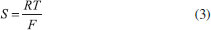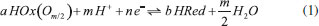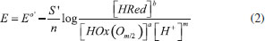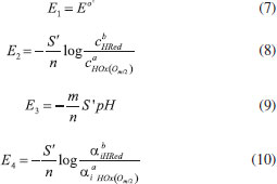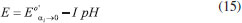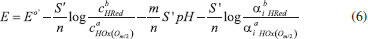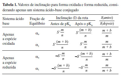 A forma oxidada e a forma reduzida podem ou não apresentar comportamento ácido-base de Brönsted. Em caso positivo, a soma dos termos E1, E2 e E3 da Equação 10 explicará apenas parcialmente a dependência do potencial medido com o pH do meio. A contribuição do termo E4 é importante nesse caso. Em relação ao termo E4, tanto pela interpretação da Figura 1B quanto pela análise matemática das Equações 13 e 14, pode-se observar que quando αi tende a zero, log αi aumenta ou diminui linearmente com o pH. Quando αi tende a 1, log αi tende a zero. Assim, a função linear na região antes do ponto onde pH é numericamente igual ao pKa apresentará uma inclinação diferente da função linear após esse ponto. Pode-se então generalizar a resposta E versus pH mediante a Equação 15: ![]() Embora a região não linear entre esses dois comportamentos esteja no intervalo próximo a pKa ± 1, o cruzamento das extrapolações das duas regiões lineares ocorre no valor de pH numericamente igual ao pKa do sistema envolvido. As inclinações (I) de cada região, "antes" e "depois" do valor de pKa podem ser deduzidas a partir da combinação das Equações 9, 10, 13 e 14. Na Tabela 1 são apresentados valores de inclinação considerando apenas um sistema ácido-base de Brönsted, tanto para a forma oxidada quanto para a forma reduzida. Quando ambas as formas têm comportamento ácido-base, os valores de pKa de cada sistema são muito importantes para definir a curva obtida e esta deve ser analisada caso a caso.