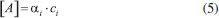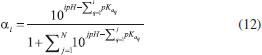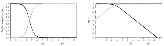 ![]() Figura 1. Diagramas de distribuição de espécies em função do pH para um sistema com comportamento ácido-base de Brönsted com pKa igual a 4,6. (A) escala linear (B) escala logarítmica