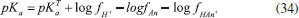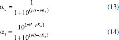 ASPECTOS TEÓRICOS Determinação de pKa baseado na variação do potencial de pico em função do pH O potencial elétrico em qualquer ponto de um voltamograma pode, a priori, ser descrito pela equação de Nernst20 considerando uma semi-reação do tipo; ![]() na qual HOx(Om/2) representa a espécie na forma oxidada; HRed representa a forma reduzida; a, m, n e b representam coeficientes estequiométricos. ![]() Na Equação 2, Eº' representa o potencial padrão condicional, que engloba os termos de coeficiente de atividade e os potenciais de junção. O parâmetro S' representa a inclinação nernstiana condicional, que considera os mesmos fatores da inclinação S (Equação 3) e também eventuais fatores associados à cinética envolvida, transporte etc., ![]() ou seja: ![]() As concentrações no equilíbrio da espécie oxidada e da espécie reduzida, que possuem comportamento ácido-base de Brönsted, estão relacionadas com a concentração analítica do sistema conjugado por meio do parâmetro fração de equilíbrio α, de acordo com a Equação 5: ![]() na qual [A] representa a concentração no equilíbrio da espécie oxidada ou espécie reduzida; ci representa a concentração analítica do sistema; ai representa a fração de equilíbrio da espécie, sendo que a convenção de numeração das frações inicia com n igual a zero para a espécie totalmente protonada. Com base nessas considerações, a Equação 2 pode ser reescrita como: ![]() Cada parcela da Equação 6, por sua vez, pode ser associado a um parâmetro Ex, sendo então separada em quatro termos. Considerando: ![]() A Equação 6 pode ser reescrita como ![]() na qual E3 e E4 representam, respectivamente, termos de influência direta e indireta sobre o pH.21 A Equação 6 é adequada independentemente do número de prótons que possam ser liberados (ou recebidos) no sistema ácido-base de Brönsted do redutor ou do oxidante, uma vez que a fração de equilíbrio é função apenas do pH e das constantes de acidez (pKa). ![]() Para o caso de um sistema monoprótico: ![]() Na Figura 1A é apresentado um exemplo de diagrama de distribuição de espécies para um sistema com comportamento ácido-base de Brönsted cujo pKa igual a 4,6 e na Figura 1B, o mesmo diagrama em escala logarítmica.