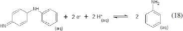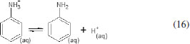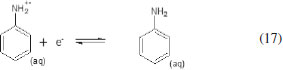 A Equação 16 representa o equilíbrio ácido base da anilina, que em solução aquosa se comporta como um sistema ácido-base de Brönsted monoprótico: ![]() cujo valor de pKa termodinâmico (força iônica µ = 0) é igual a 4,601.22 Diversos mecanismos para explicar a oxidação da anilina e os possíveis produtos gerados têm sido propostos.23-25 Segundo os autores, o pH do meio reacional influencia fortemente o tipo de subproduto obtido no processo de oxidação. Mediante a abstração de um elétron da anilina neutra, deve ocorrer a formação de um intermediário cátion radical, o qual pode passar por diferentes tipos de acoplamento, levando a formação de p-aminofenilamida, benzidina, azobenzeno etc. Parece haver um consenso em relação à primeira etapa do processo, radicalar, com a abstração de um elétron: ![]() A formação do dímero apresentado na Equação 18 foi provada por Bacon.26 ![]()