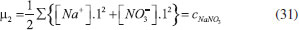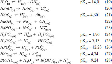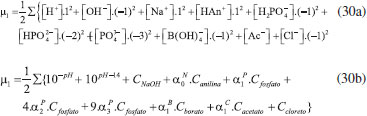 PARTE EXPERIMENTAL Reagentes Todos os reagentes utilizados nesse trabalho foram de grau analítico de pureza (P. A.) e não foram submetidos a nenhum processo posterior de purificação. O ácido clorídrico 1,00 mol L-1 e tampão Britton Robson (BR) 0,04 mol L-1 foram utilizados para ajuste do pH, respectivamente, nos estudos exploratórios iniciais e no estudo da influência da força iônica por voltametria de pulso diferencial. O tampão Britton Robson foi preparado a partir da mistura de quantidades apropriadas de soluções estoque padronizadas de ácido fosfórico 0,9897 mol L-1, ácido bórico 0,5059 mol L-1 e ácido acético 1,334 mol L-1 e hidróxido de sódio 8 mol L-1 para o valor de pH desejado no intervalo compreendido entre 2,00 e 7,00, com variações de 0,5000 unidades de pH. A padronização do ácido cítrico, fosfórico e acético, que compõem o tampão BR, foi realizada com os padrões primários Riedel-De-Haenag tetraborato de potássio deca-hidratado, ftalato ácido de potássio e indicador fenolftaleína da Sigma-Aldrich®, seguindo as recomendações da literatura.27 O cloridrato de anilina (> 99%) usado como composto modelo neste trabalho, foi obtido da Sigma-Aldrich®. Os demais reagentes mencionados foram de procedência da Vetec. A força iônica das soluções foi ajustada de duas maneiras, denominadas de condição A e B: Condição A: Desta maneira, para solução de cloridrato de anilina 4,00 x 10-3 mol L-1 no intervalo de pH compreendido entre 2,00 e 7,00 (ajustado com tampão BR) foi realizada a adição de massa necessária do eletrólito nitrato de sódio de maneira que a concentração na solução final de NaNO3 fosse de 0,400 mol L-1. Para cada valor de pH foi preparada também uma solução em branco com todas as espécies mencionadas exceto o cloridrato de anilina. Condição B: Para cada valor de pH no intervalo de 2,00 à 7,00 ajustado com tampão BR foi realizada a adição de massa de eletrólito necessária para manter a força iônica µ final da solução em um valor constante igual 0,5000 mol L-1, considerando nessa situação, a contribuição de todas as espécies ionizadas presentes na solução, sendo estas provenientes da solução - tampão, da solução de hidróxido de sódio e do cloridrato de anilina 4,00 x 10-3 mol L-1. Para cada valor de pH foi preparado uma solução em branco com todas as espécies mencionadas exceto o cloridrato de anilina. Instrumentação As medidas voltamétricas foram realizadas em temperatura de (25±1) °C em um potenciostato/galvanostato μAutolab Type III (Eco-Chemie, Utrecht, Países Baixos) interfaciado a um computador pelo software GPES (versão 4.9), utilizando uma célula eletroquímica de aproximadamente 50 mL com arranjo de três eletrodos, sendo um eletrodo de trabalho de carbono vítreo (GCE) com área superficial de 0,127 cm2, um eletrodo auxiliar de platina e um eletrodo de referência Ag|AgCl,KCl (3,0 mol L-1), todos da Metrohm. O polimento da superfície do eletrodo de trabalho foi realizado por 1 minuto antes de cada medida utilizando-se um feltro metalográfico contendo uma suspensão de α-alumina de granulometrias 0,3 e 0,05 μm (Buehler, EUA). A voltametria cíclica (CV) foi realizada em uma janela de potencial entre 2,0 V e - 2,0 V vs Ag|AgCl, KCl (3 mol L-1) a uma velocidade de varredura de 100 mV s-1, com soluções que continham apenas o analito (4,0 x 10-3 mol L-1) e o eletrólito (NaNO3 0,4 mol L-1). O pH das soluções foi ajustado para 3,5 com HCl. Para as condições A e B de ajuste de força iônica, a varredura de potencial na técnica voltametria de pulso diferencial (DPV) foi realizada no intervalo de zero a +1,7 V vs Ag|AgCl, KCl, 3 mol L-1. Os parâmetros usados foram: velocidade de varredura (v) 20 mV s-1, amplitude de pulso (A) 175 mV e tempo de pulso (tp) 5 ms. O pH de todas soluções foi aferido com pHmetro Metrohm modelo 827PLab e eletrodo de vidro combinado previamente calibrado a 25 ºC, em temperatura de (25±1) °C. Cálculos da força iônica em cada condição experimental A solução formada pelo cloridrato de anilina em meio de tampão BR e nitrato de sódio como eletrólito inerte pode ser descrita pelas equações químicas apresentadas nas Equações 18 a 27. As equações 20, 22 e 23 representam processos de dissociação completa, respectivamente, do cloridrato de anilina, hidróxido de sódio e nitrato de sódio. As equações 19, 21 e 24-28 representam respectivamente os equilíbrios de autoionização da água, equilíbrios ácido base da anilina e dos componentes do tampão BR. ![]() A força iônica foi calculada a partir da Equação 29: ![]() A força iônica total em cada condição foi dividida em duas contribuições. A primeira (µ1), associada aos componentes do tampão BR, anilina e água, e a segunda (µ2), associada ao eletrólito inerte, nitrato de sódio. Para a condição A, o cálculo de µ2 por sua vez, considerou apenas a contribuição do eletrólito nitrato de sódio em concentração equivalente a 100 vezes a concentração do cloridrato de anilina. Para a condição B, o valore de µ2 foi obtido pela diferença entre a força iônica desejada, igual a 0,500 mol L-1 e a contribuição µ1 ![]() Na Equação 30b, os símbolos P, B, C e N apresentados como superíndices nos valores de α, são representações para distinguir entre os sistemas fosfato, borato, acetato e anilina, respectivamente. ![]() Cálculo do valor de pKa teórico esperado para força iônica µ = 0,500 mol L-1 Para fins de comparação e avaliação da qualidade dos resultados obtidos experimentalmente, o valor de pKa teórico em µ = 0,500 mol L-1 foi obtido graficamente por ajuste polinomial dos valores disponíveis de pKa versus