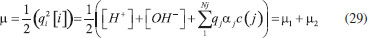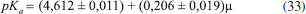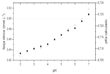 ![]() Figura 6. Variação da força iônica (µ) para a condição A e de pKa teórico em função do pH. (○) força iônica calculada pela Equação 28; (■) pKa calculado pela Equação 33