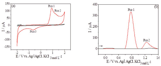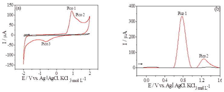 ![]() Figura 2. a) Voltametria cíclica e b) voltametria de pulso diferencial na ausência (-) e na presença ( ) de cloridrato de anilina 4,00 x 10-3 mol L-1 em solução de NaNO3 0,400 mol L-1, pH = 3,50, ajustado com HCl